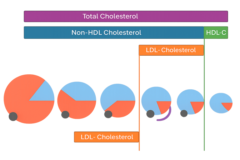Non-HDL cholesterol represents all of the cholesterol carried in potentially harmful particles.