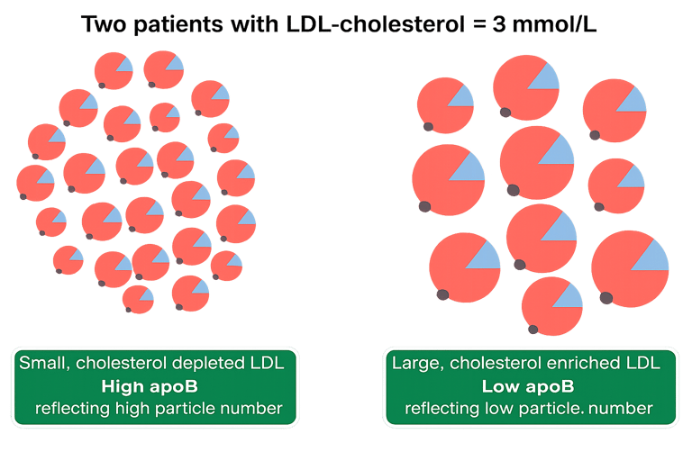 Each of these particles carries one ApoB molecule, so ApoB gives a direct measure of particle number.